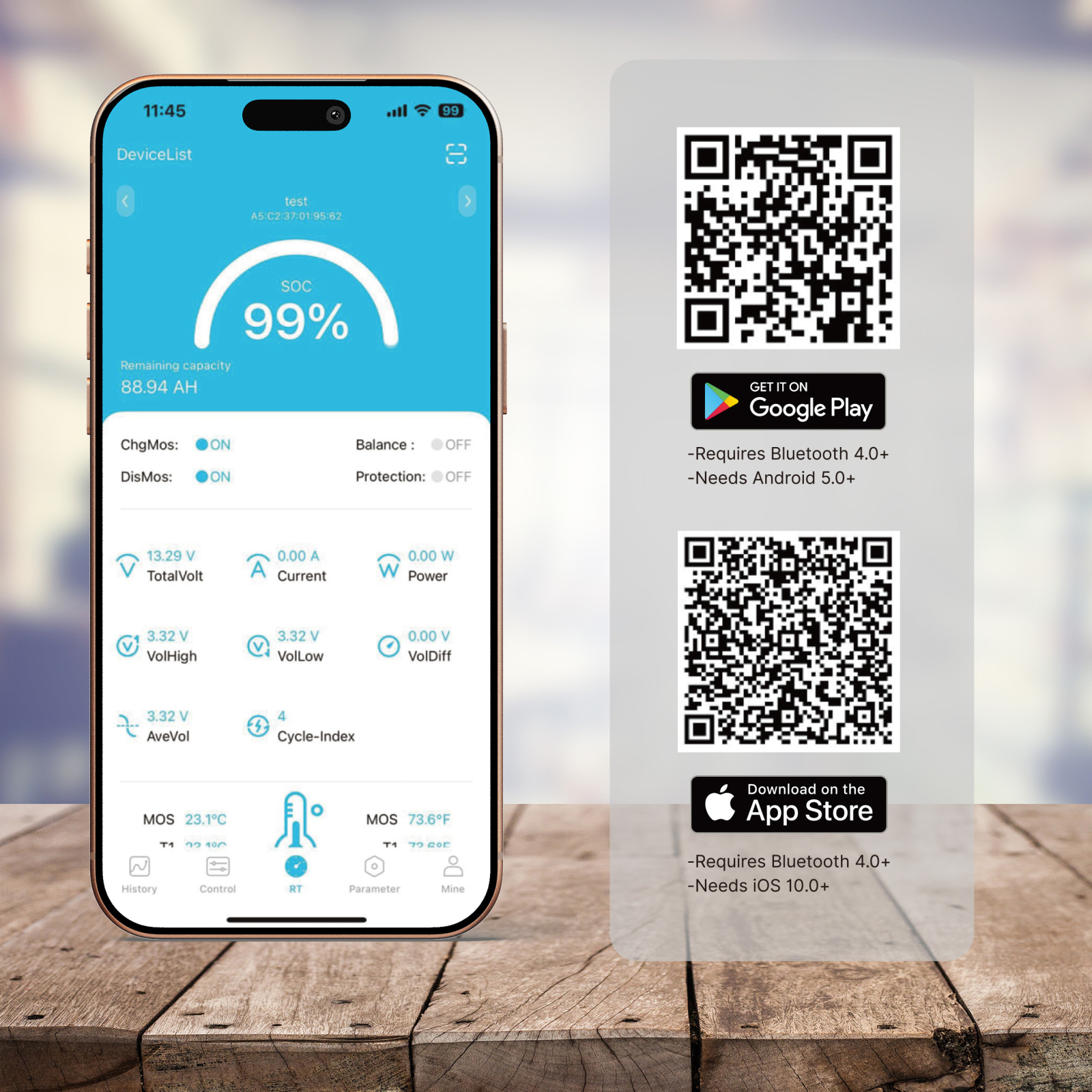 Bateria este echipata cu Smart BMS cu Bluetooth integrat. Prin aplicatie (iOS si Android) poti verifica in timp real: