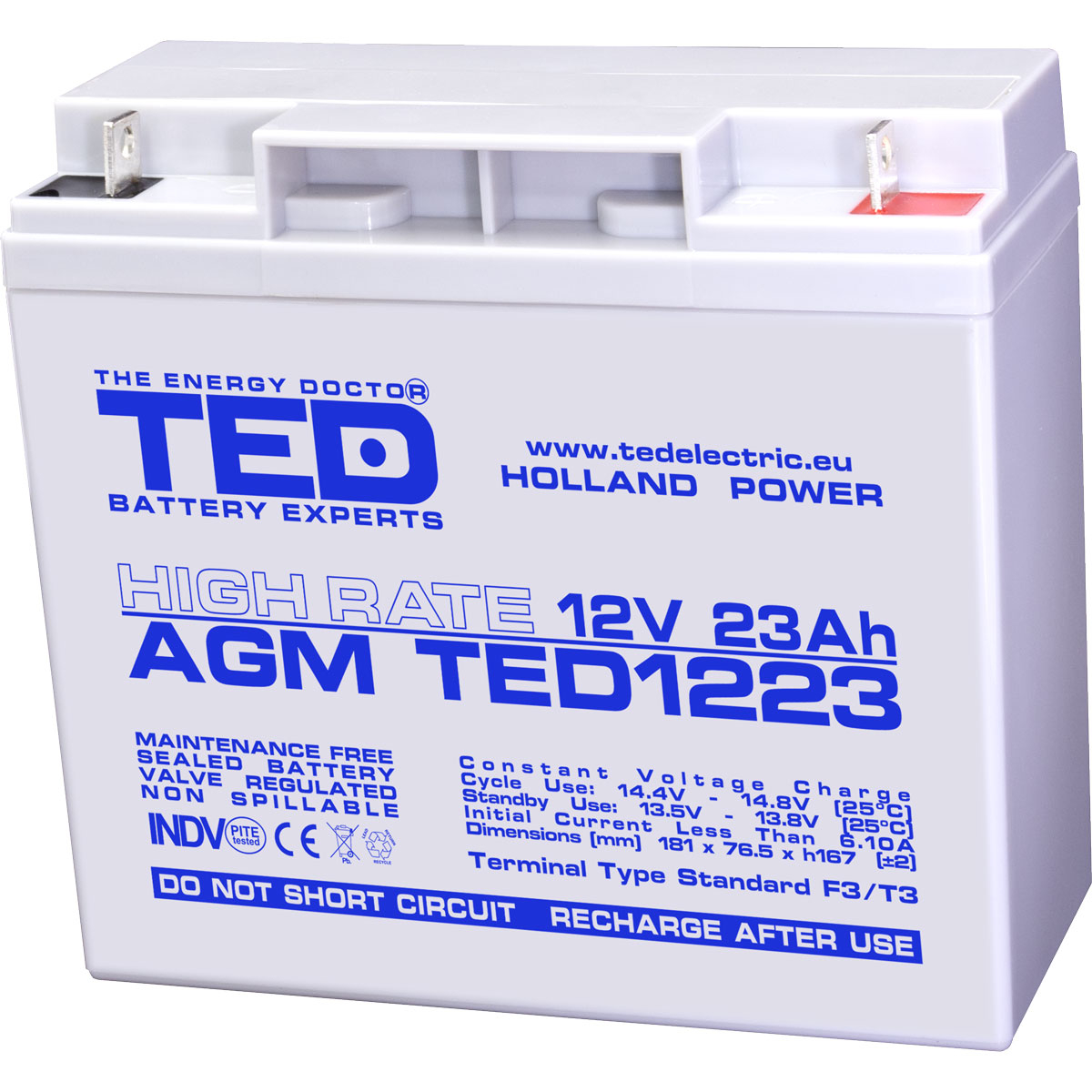 Ted Electric Acumulator 12V High Rate, Dimensiuni 181 x 76 x 167 mm, Baterie 12V 23Ah F3, TED Electric TED003348