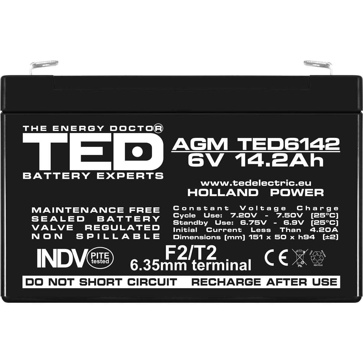 Acumulator 6V Stationar VRLA, Dimensiuni 151 x 50 x 95 mm, Baterie 6V 14.2Ah F2, TED Electric TED003034