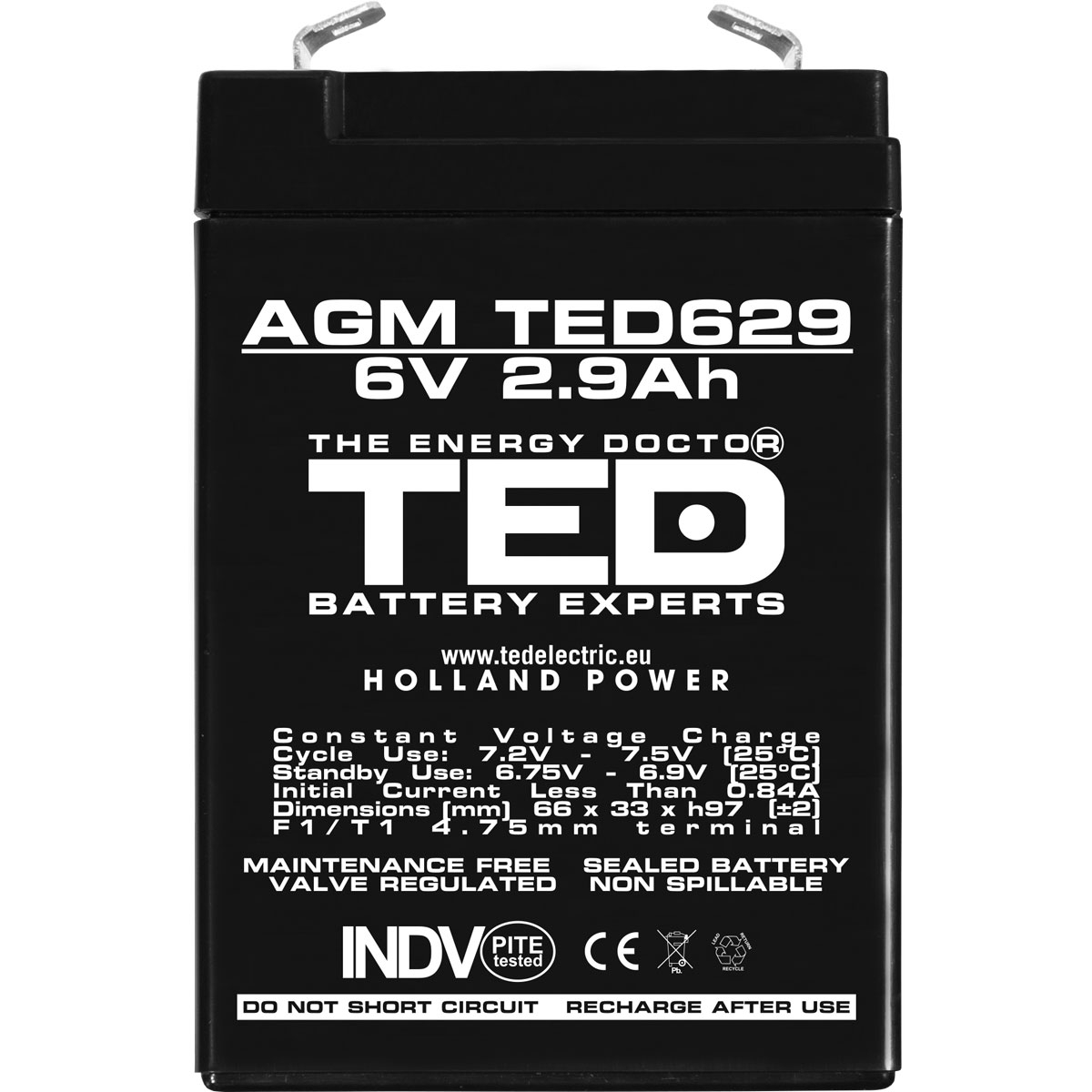 Acumulator Stationar AGM VRLA Etans 6V 2.9A F1 T1, Dimensiuni 66mm x 33mm x h97mm, TED Electric este o sursa de energie fiabila si versatila, ideala pentru aplicatii care necesita o alimentare constanta si sigura. Electrolitul din acumulatorii AGM este complet absorbit in separatoare compuse din fibra de sticla absorbanta. Aceasta tehnologie ofera rezistenta la curenti mari, aplicatii de mare putere, vibratii si medii extrem de reci. Avand rezistenta interna scazuta, acumulatorul AGM permite incarcari si descarcari mai rapide.