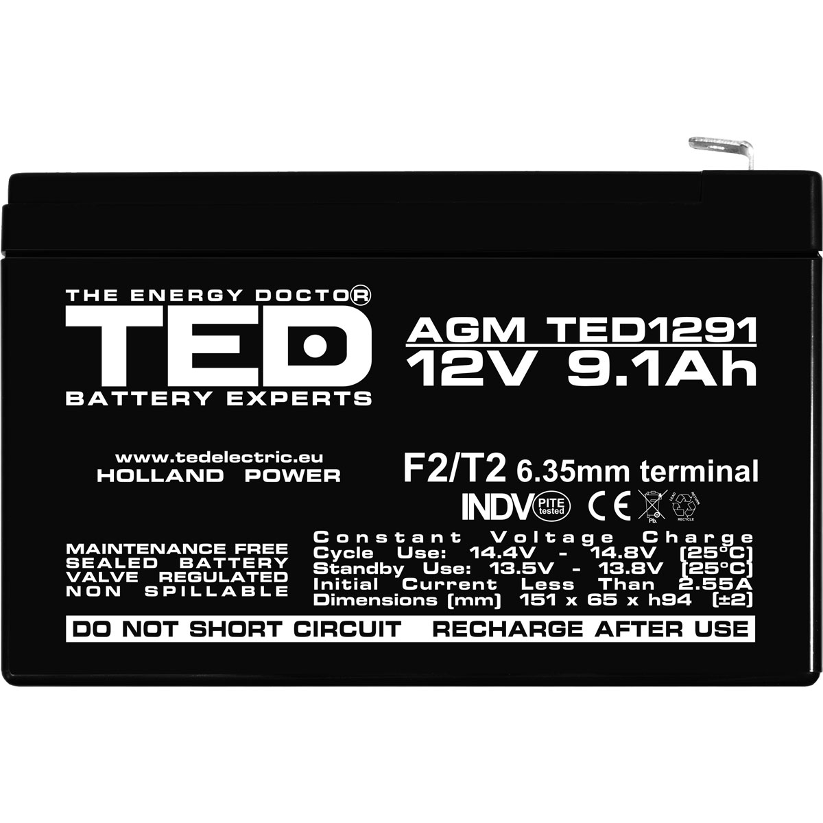 Ted Electric Acumulator 12V Stationar VRLA, Dimensiuni 151 x 65 x 95 mm, Baterie 12V 9.1Ah F2, TED Electric TED003263