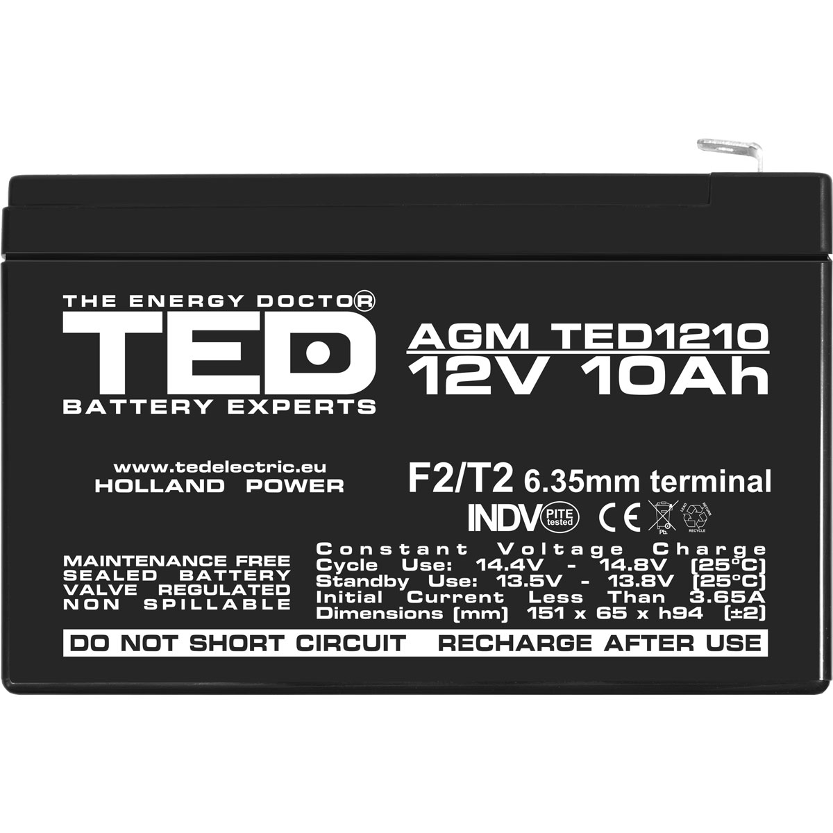 Acumulator 12V Stationar VRLA, Dimensiuni 151 x 65 x 95 mm, Baterie 12V 10Ah F2, TED Electric TED002730