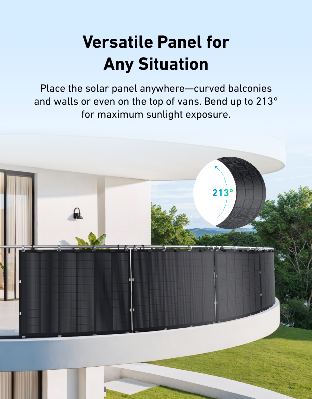 Plasati panoul solar oriunde - balcoane si pereti curbati sau chiar in partea de sus a dubelor. Indoiti pana la 213° pentru o expunere maxima la lumina soarelui.
