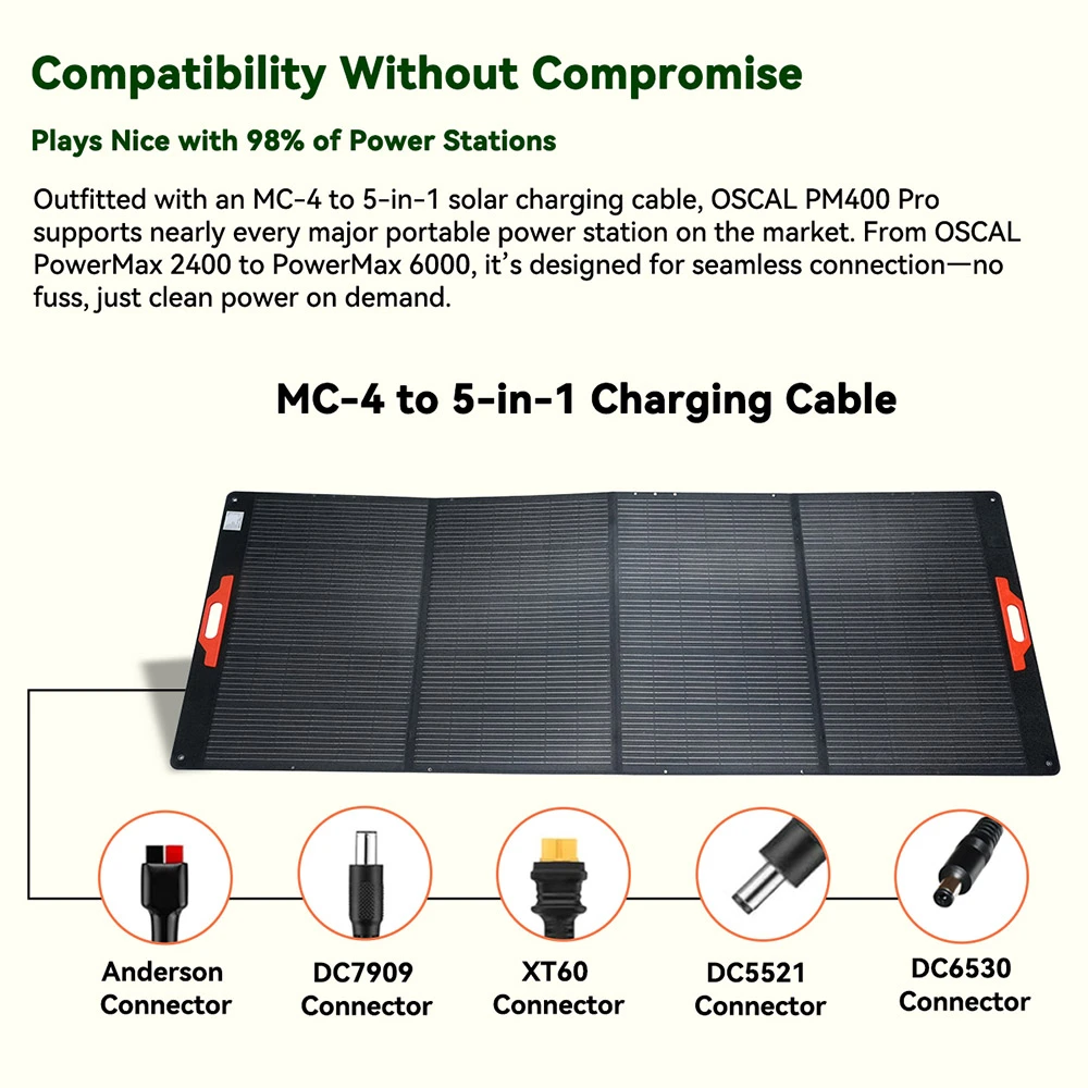 Echipat cu un cablu de incarcare solara MC-4 la 5-in-1, panoul solar OSCAL PM400 Pro este compatibil cu majoritatea generatoarelor solare de pe piata si functioneaza perfect, in special cu statiile electrice portabile OSCAL PowerMax 3600 si PowerMax 6000.