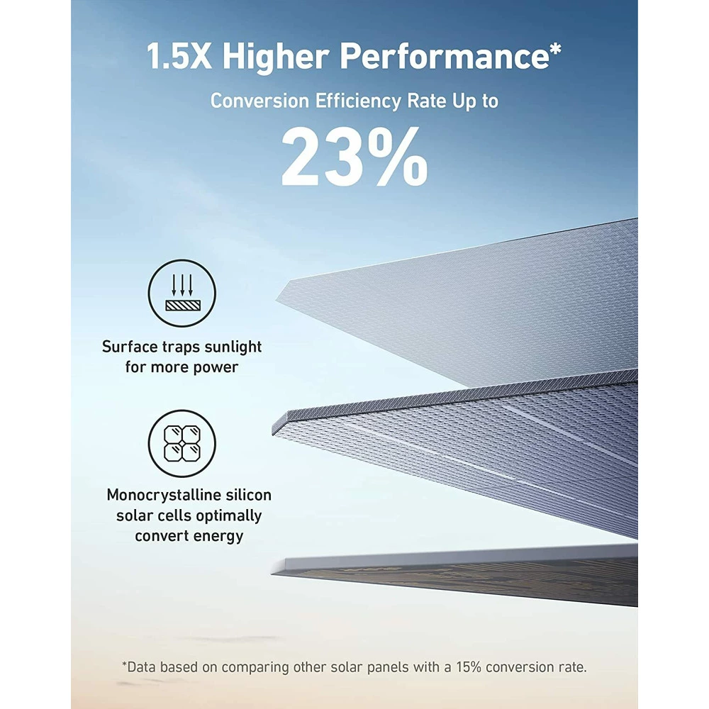 Echipat cu celule solare monocristaline cu o eficienta de 23,4%, panoul solar Anker 200W ofera performante optime. Cu suportul sau reglabil, puteti pozitiona panoul cu precizie la cel mai bun unghi de 30_, 40_, 50_ sau 80_ - pentru un randament energetic maxim, chiar si atunci cand soarele se misca. Tehnologia avansata Suncast de la Anker maximizeaza absorbtia luminii solare, rezultand o performanta si mai buna a panoului.