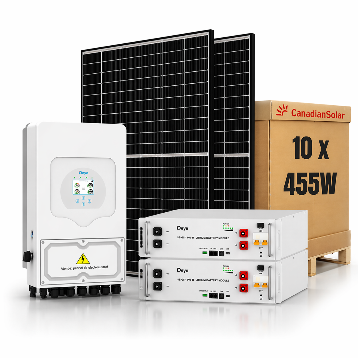 Sistem fotovoltaic hibrid 6kW complet, echipat cu invertor Deye SUN-6K-SG05LP1-EU, 10 panouri Canadian Solar (4.55kWp) si baterie de stocare Deye 10.24kWh, ideal pentru locuinte care doresc reducerea facturilor si cresterea independentei energetice.