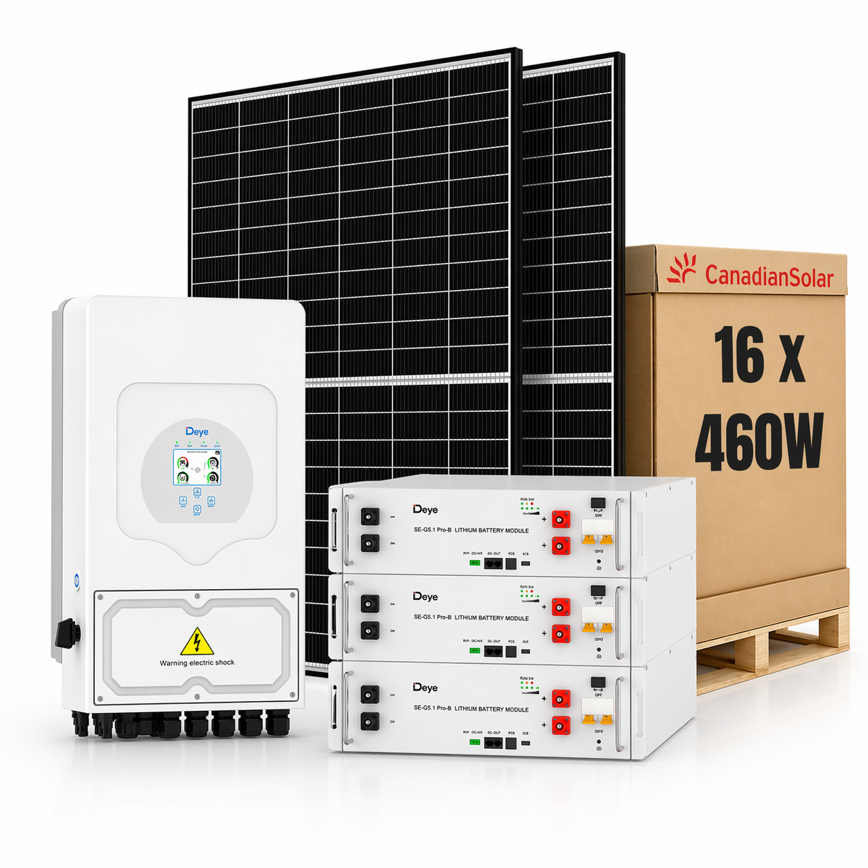 Sistem fotovoltaic hibrid 8kW complet, echipat cu invertor Deye, 16 panouri Canadian Solar (7.36kWp) si baterie de stocare 15.36kWh, conceput pentru locuinte cu consum mediu si ridicat care doresc un nivel ridicat de autonomie energetica.