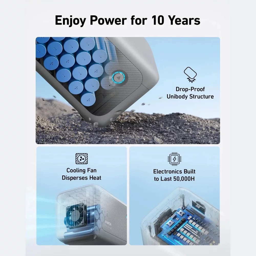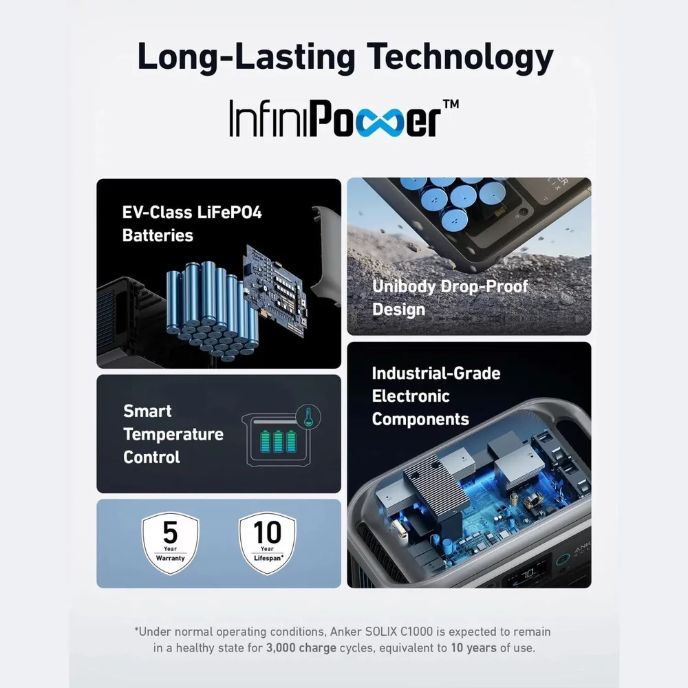 Cu o durata de viata remarcabila de 3000 de cicluri si o durata de viata garantata de 10 ani, aceasta baterie este construita pentru a rezista, oferind putere de incredere pentru anii urmatori. Anker sustine calitatea produselor sale, oferind o garantie de 5 ani pentru o liniste sporita. Indiferent daca sunteti in afara retelei, in camping sau va confruntati cu o intrerupere de curent, bateria de extindere Anker SOLIX BP1000X va asigura ca aveti puterea de care aveti nevoie, atunci cand aveti nevoie de ea.