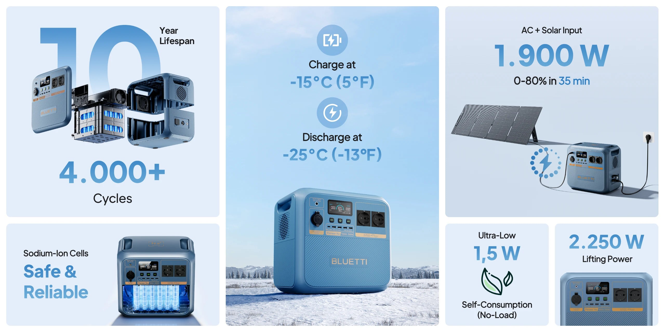 Tehnologia bateriei cu ioni de sodiu diferentiaza acest model de majoritatea statiilor de alimentare. Aceste celule sunt mai grele decat variantele LFP, ducand greutatea totala la 16 kg, dar ofera avantaje clare in conditii de frig. Pioneer Na poate fi incarcata la temperaturi de pana la -15 °C si descarcata pana la -25 °C, mentinand pana la 80% din capacitate chiar si in conditii de inghet. Este astfel o alegere fiabila pentru utilizare pe timp de iarna, calatorii in zone reci sau ca sistem de rezerva pentru locuinta.