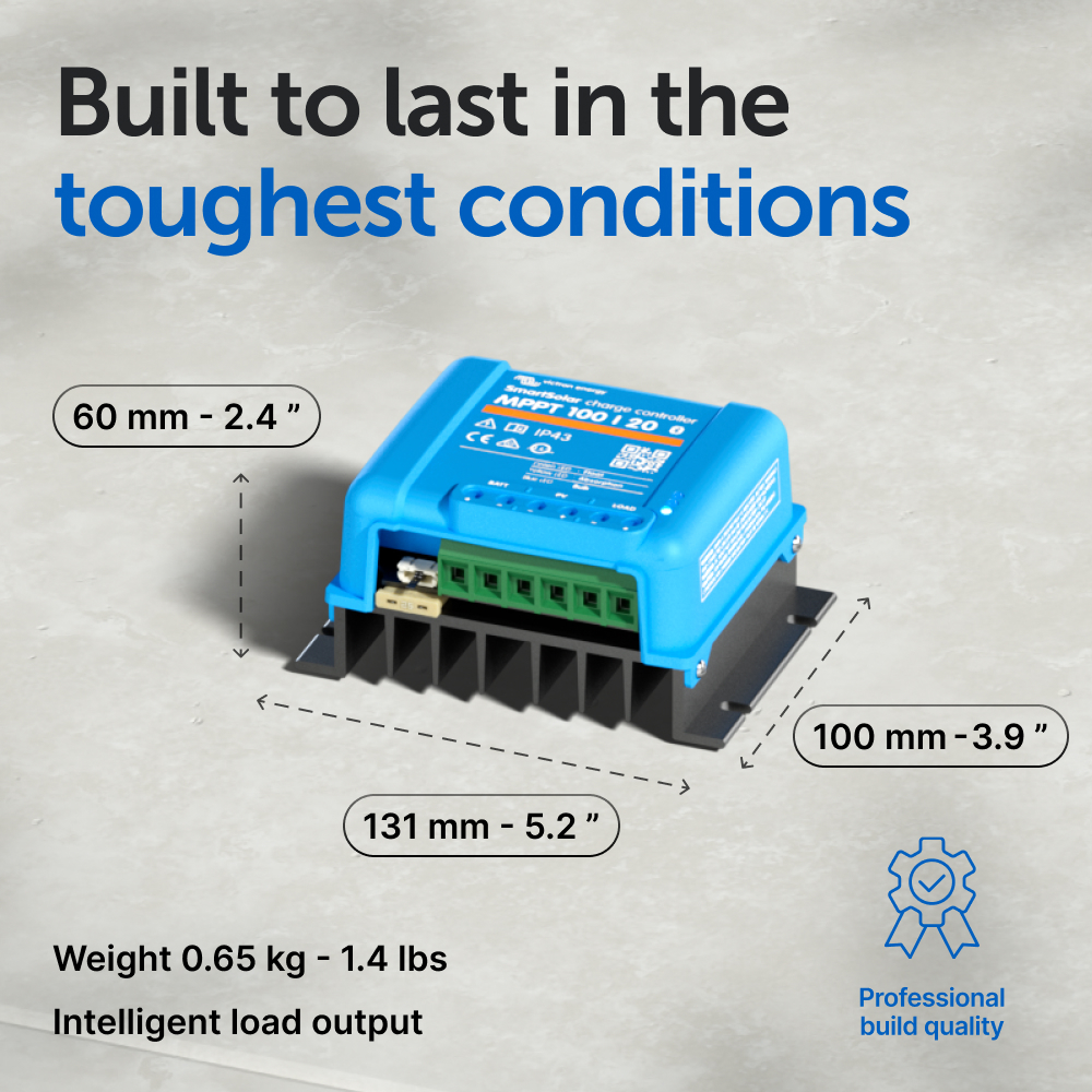 Victron SmartSolar MPPT 100/20 este un regulator solar performant, destinat sistemelor fotovoltaice de 12V, 24V sau 48V, unde eficienta ridicata si monitorizarea din telefon sunt esentiale.